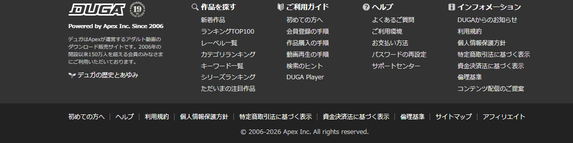 - DUGAではサイトのフッターにリンク先がまとめてある