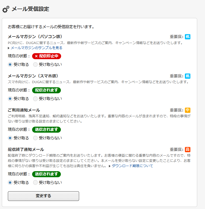 受信設定画面では、ご利用通知メールと配信終了通知メールに重要度「中」や「高」の表示が付いています。こうした項目はメールマガジンとは役割が違って、利用状況や期限に関わる案内が含まれます。私自身が使っている範囲では、こちらを受け取る設定にしていても売り込みのようなメールを受信することはありませんでした。基本的に手続きの内容などが届く場面があるくらいなので、迷ったら重要度の高いメールは受信しておく方が安心だと思います。