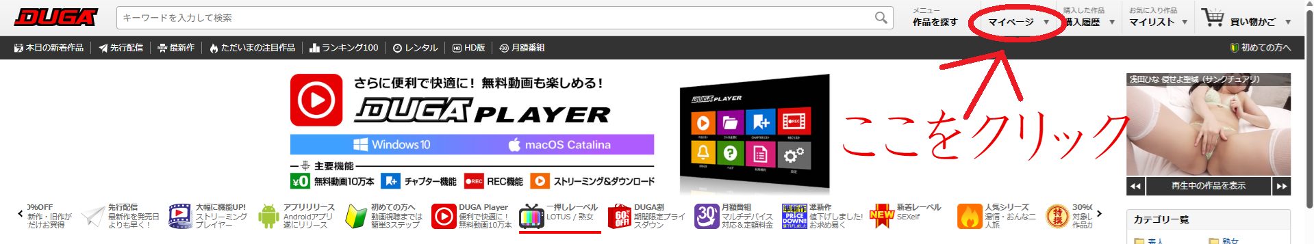 まずはDUGAにアクセスし、画面右上のアカウント名(または人型アイコン)からマイページを開きます。