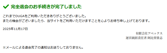 完全退会する(送信)を押すと、このような退会完了のページが表示されます。これでDUGAの退会は完了です。以降は配信メールの対象外となり、DUGAのメールも一切届きません。退会完了メールも送信されません。