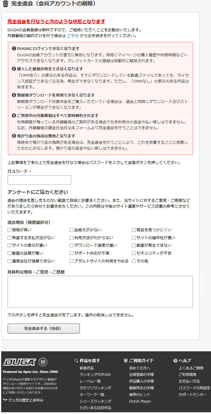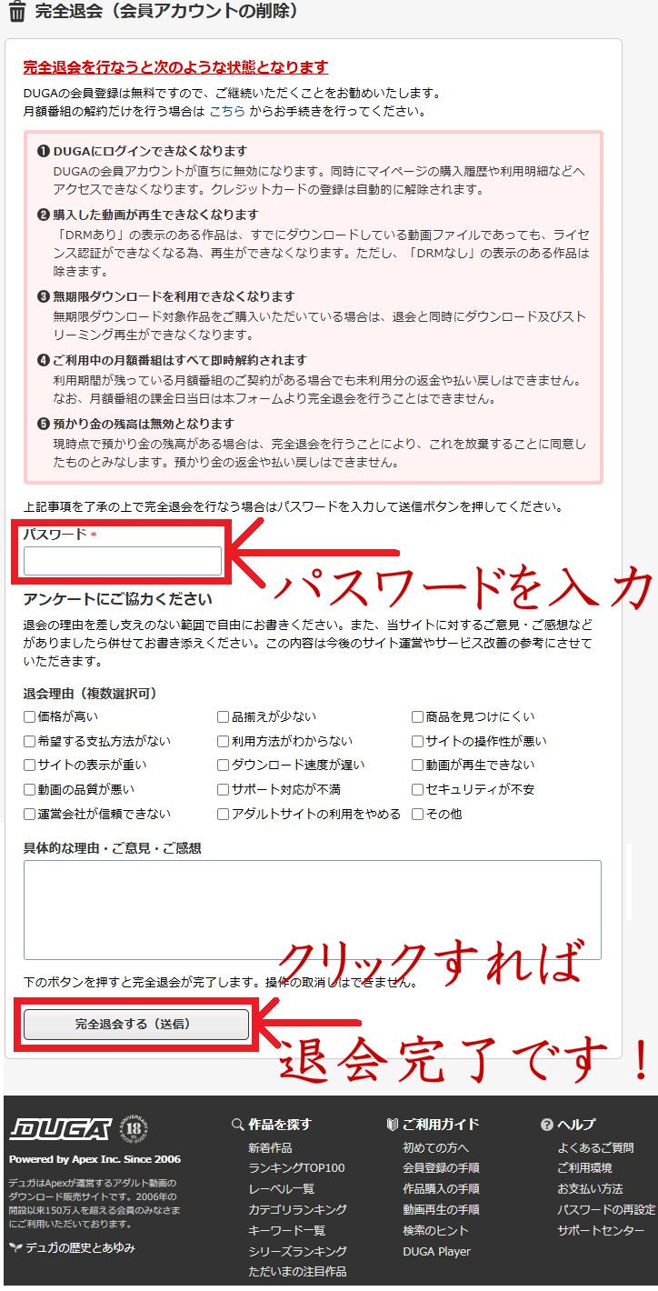 ”完全退会(アカウントの削除)”をクリックすると、こちらの画像のページへ移動します。パスワードの項目に、DUGAへログインする際に使用するパスワードを入力します。